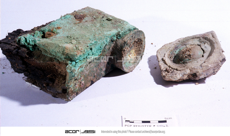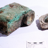Cu/Cu alloy door hinge + lead/ Cu alloy mount. Pre-conservation. - Sq. K3. Studio. Locus 18/Pail 36. Reg # PCP 0042.