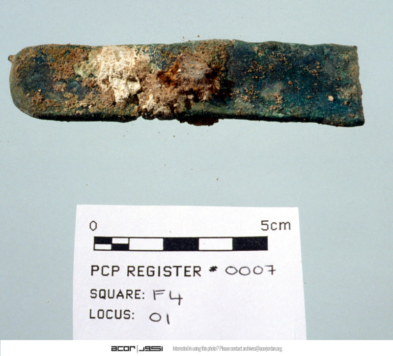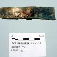 Bronze piece with plaster. Pre conservation. - Sq. F4. Studio. Locus 01 Pail 07. Reg #PCP. 0007.