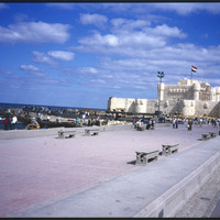 Where Lighthouse of Pharos was and where underwater archaeology found Alexander-built causeway; Mamluk castle to right