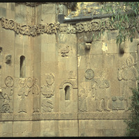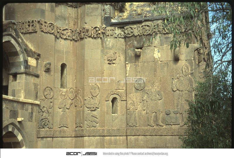 تفاصيل نقوش بارزة تصور القديس إسحاق، وحمازة أرتزروني، والنبي إيلي، والنبي صموئيل، وملك إسرائيل شاول، والنبي داود وجليات العملاق على كنيسة الصليب المقدس