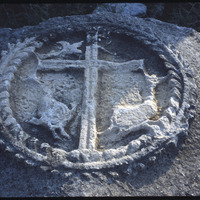 تفاصيل نقش بارز يصور صليب محاطًا بإكليل من الزهور
