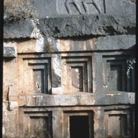 تفاصيل واجهة مقبرة منحوتة في الصخر مع نقوش بارزة