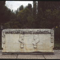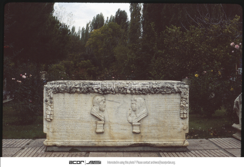 تابوت علية نقش بارز لرجل وإمرأة وكتابات لاتينية