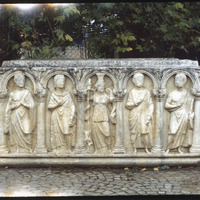 تابوت عمودي عليه نقوش بارزة لخمسة شخصيات