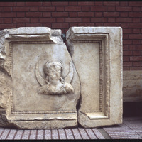 تفاصيل لوحة لنقش بارز تصور رأس بشري مع هلال
