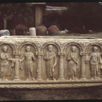 تابوت عمودي عليه نقوش بارزة لشخصيتين