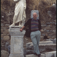 رجل يقف بجانب تمثال بدون رأس