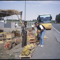 سائح يشتري التفاح من بائع على جانب الطريق