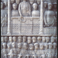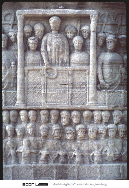 تفاصيل قاعدة مسلّة ثيودوسيوس تُظهِر الإمبراطور يقدّم أمجادًا