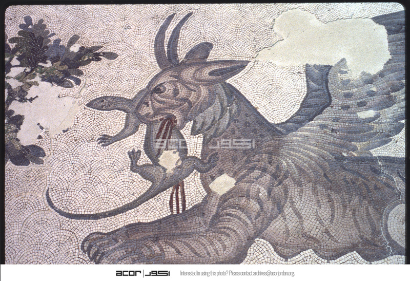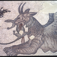 تفاصيل فسيفساء تصور كائن أسطوري يأكل حرباء