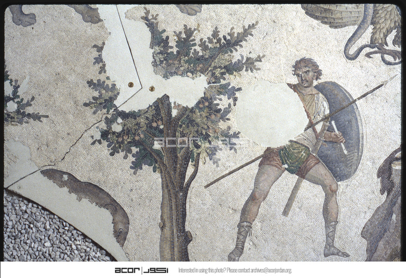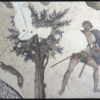 تفاصيل فسيفساء تصور صيادًا وشجرة