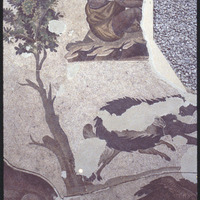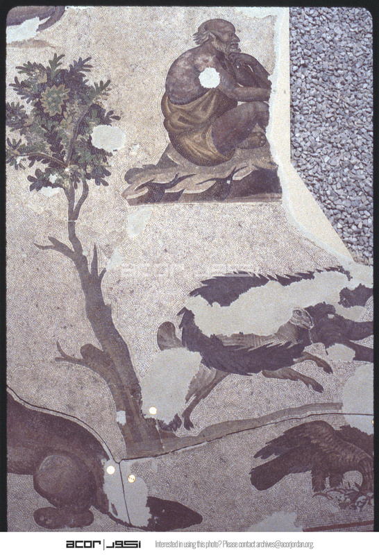 تفاصيل فسيفساء لرجل جالس وحيوانات