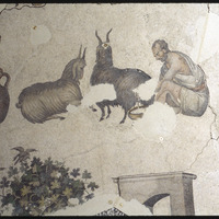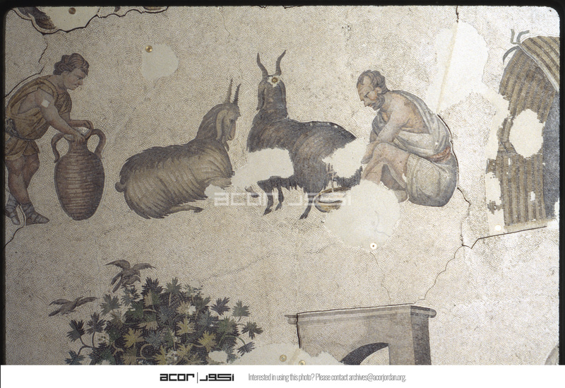 تفاصيل فسيفساء تصور رجالًا يحلبون ماعزًا