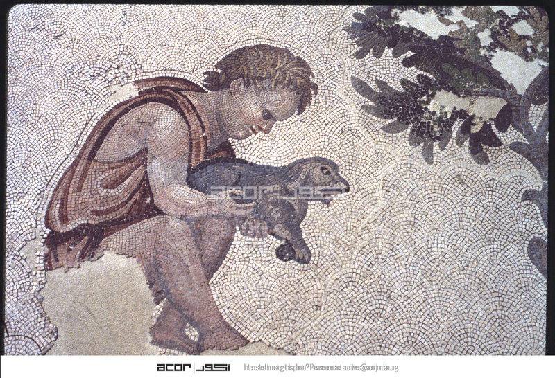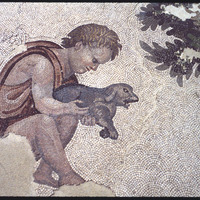 تفاصيل فسيفساء لطفل يحمل كلبًا