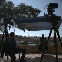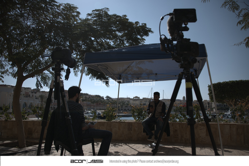 الأردن. العقبة، فريق عمل مشروع استدامة الإرث الثقافي بمشاركة المجتمعات المحلية خلال تصوير فيديو مع فريق عقباوي