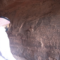 الأردن. وادي رم، فن صخري على جبل الخزعلي، يظهر في الصورة محمد ضميان