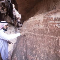 الأردن. وادي رم، فن صخري على جبل الخزعلي، يظهر في الصورة هشام المجالي ومحمد ضميان