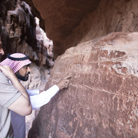 الأردن. وادي رم، فن صخري على جبل الخزعلي، يظهر في الصورة هشام المجالي ومحمد ضميان