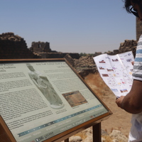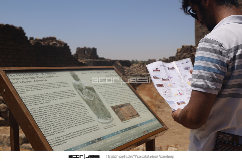 الأردن. أم الجمال، إحدى زوار موقع أم الجمال الأثري أثناء قراءة خريطة الموقع من أمام لوحة تفسيرية