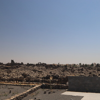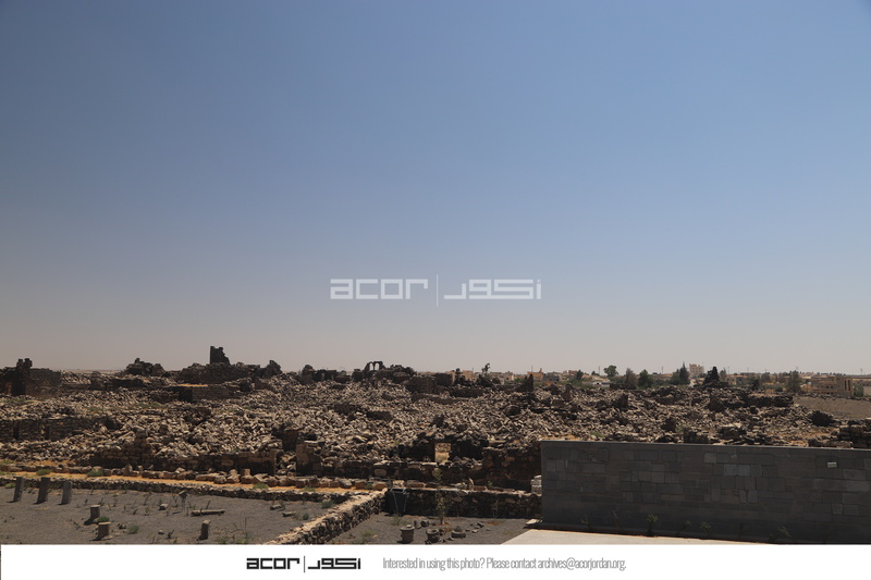 الأردن. أم الجمال، إطلالة إلى موقع أم الجمال الأثري من مركز الزوار، يظهر في الصورة معرض النقوش