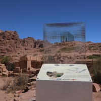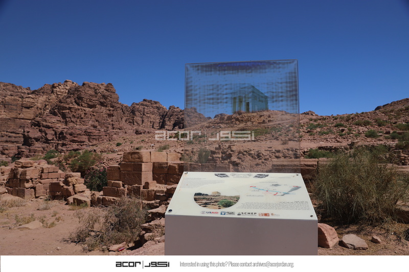 الأردن. البترا، معبد الأسود المجنحة، الإطلالة من شارع الأعمدة إلى المعبد، يظهر في الصورة لوحة تم تركيبها بدعم من المركز الأمريكي للأبحاث من خلال مشروع استدامة الإرث الثقافي بمشاركة المجتمعات المحلية