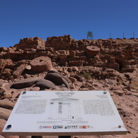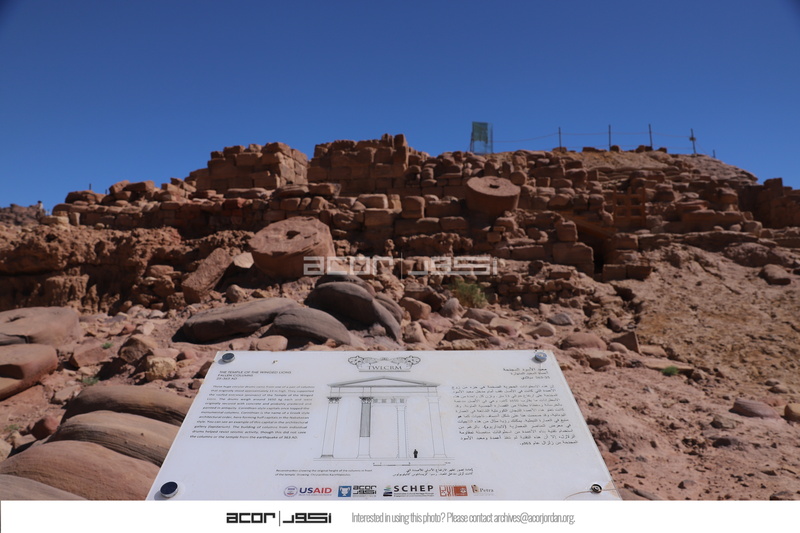 الأردن. البترا، معبد الأسود المجنحة، يظهر في الصورة لوحة تفسيرية تم تصميمها وتركيبها بدعم من المركز الأمريكي للأبحاث من خلال مشروع استدامة الإرث الثقافي بمشاركة المجتمعات المحلية