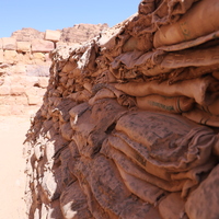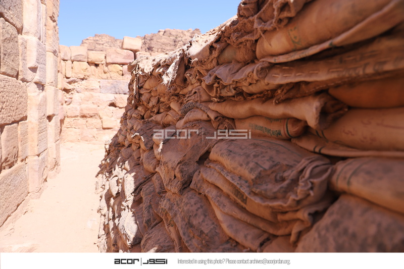 الأردن. البترا، أكياس رملية تم تعبئتها من قبل سيدات محليات لدعم أعمال تطوير معبد الأسود المجنحة