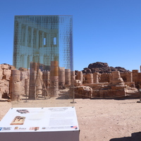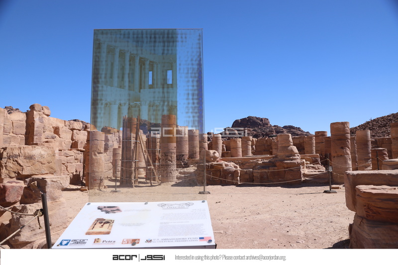 الأردن. البترا، معبد الأسود المجنحة، يظهر في الصورة لوحة تفسيرية تم تصميمها وتركيبها بدعم من المركز الأمريكي للأبحاث من خلال مشروع استدامة الإرث الثقافي بمشاركة المجتمعات المحلية