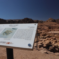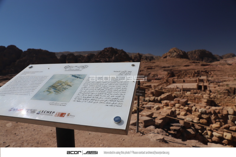 الأردن. البترا، معبد الأسود المجنحة، يظهر في الصورة لوحة تفسيرية تم تصميمها وتركيبها بدعم من المركز الأمريكي للأبحاث من خلال مشروع استدامة الإرث الثقافي بمشاركة المجتمعات المحلية
