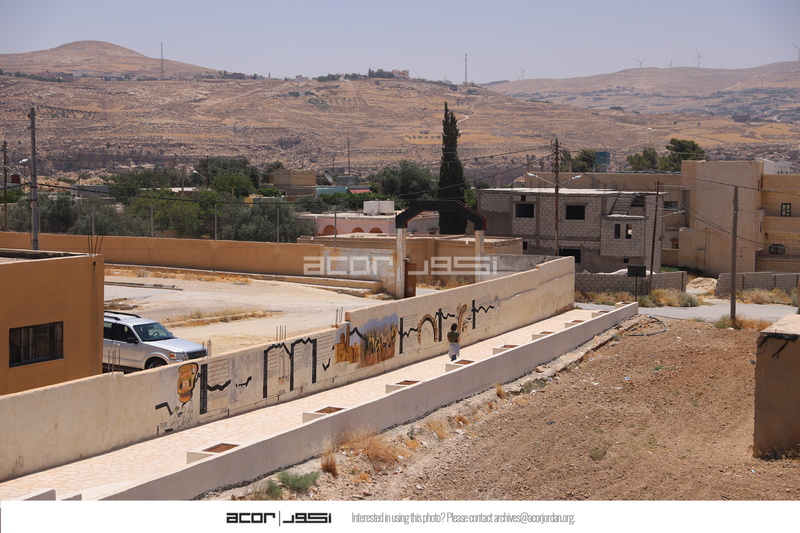الأردن. بصيرا، مدخل موقع بصيرا الأثري يظهر في الصورة لوحة جدارية حول تاريخ الموقع