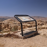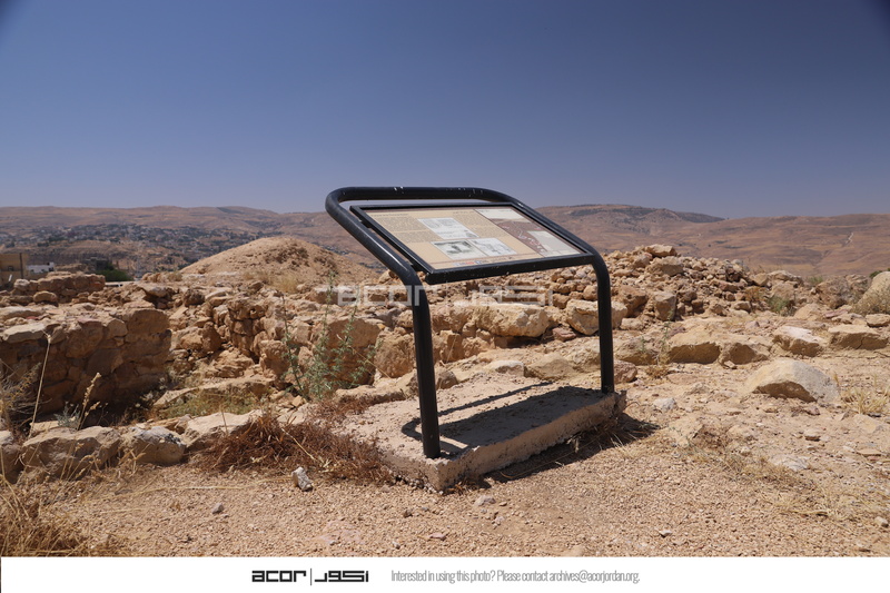 الأردن. بصيرا، لوحة تفسيرية في موقع بصيرا الأثري من تصميم وتركيب المركز الأمريكي للأبحاث من خلال مشروع استدامة الإرث الثقافي بمشاركة المجتمعات المحلية