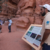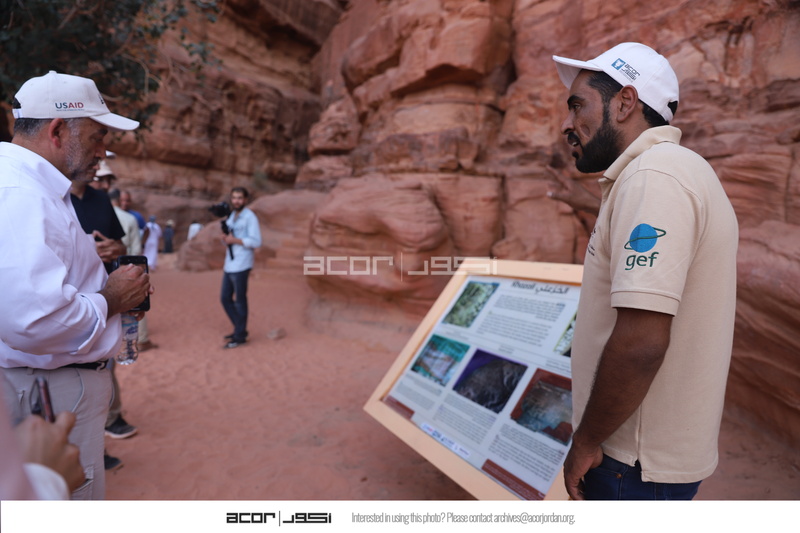الأردن. وادي رم، محمد ضميان وأعضاء من فريق مشروع استدامة الإرث الثقافي بمشاركة المجتمعات المحلية أمام لوحة تفسيرية تم تركيبها بدعم من المركز الأمريكي للأبحاث من خلا مشروع استدامة الإرث الثقافي بمشاركة المجتمعات المحلية