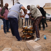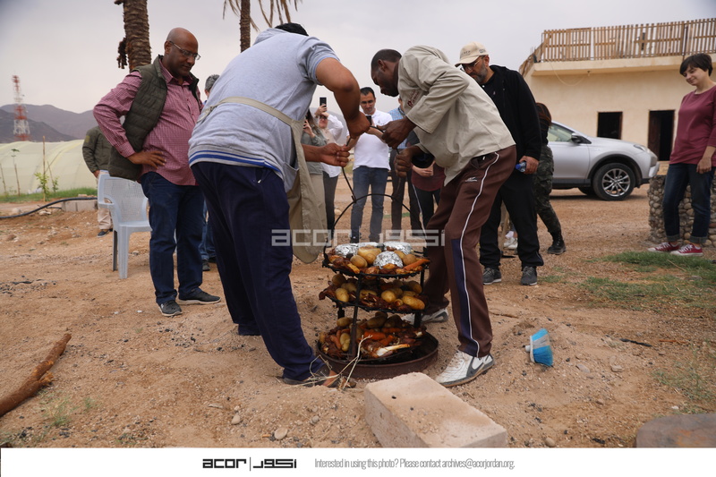 الأردن. غور الصافي، فريق المركز الأمريكي للأبحاث وأعضاء من فريق مشروع استدامة الإرث الثقافي بمشاركة المجتمعات المحلية والوكالة الأمريكية للتنمية الدولية في زيارتهم إلى مطبخ الصافي لتجربة مجموعة من تجارب السياحة الزراعية