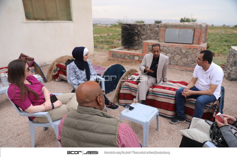 الأردن. غور الصافي، فريق المركز الأمريكي للأبحاث وأعضاء من فريق مشروع استدامة الإرث الثقافي بمشاركة المجتمعات المحلية والوكالة الأمريكية للتنمية الدولية في زيارتهم إلى مطبخ الصافي لتجربة مجموعة من تجارب السياحة الزراعية
