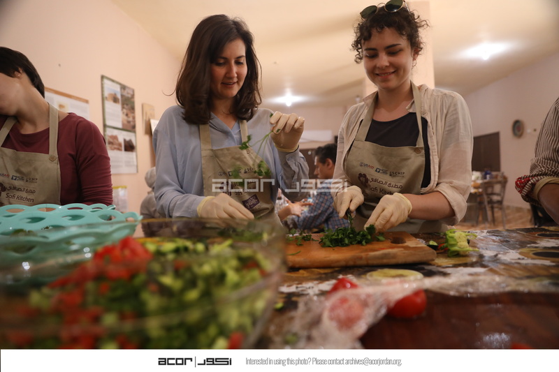 الأردن. غور الصافي، فريق المركز الأمريكي للأبحاث وأعضاء من فريق مشروع استدامة الإرث الثقافي بمشاركة المجتمعات المحلية والوكالة الأمريكية للتنمية الدولية في زيارتهم إلى مطبخ الصافي لتجربة مجموعة من تجارب السياحة الزراعية