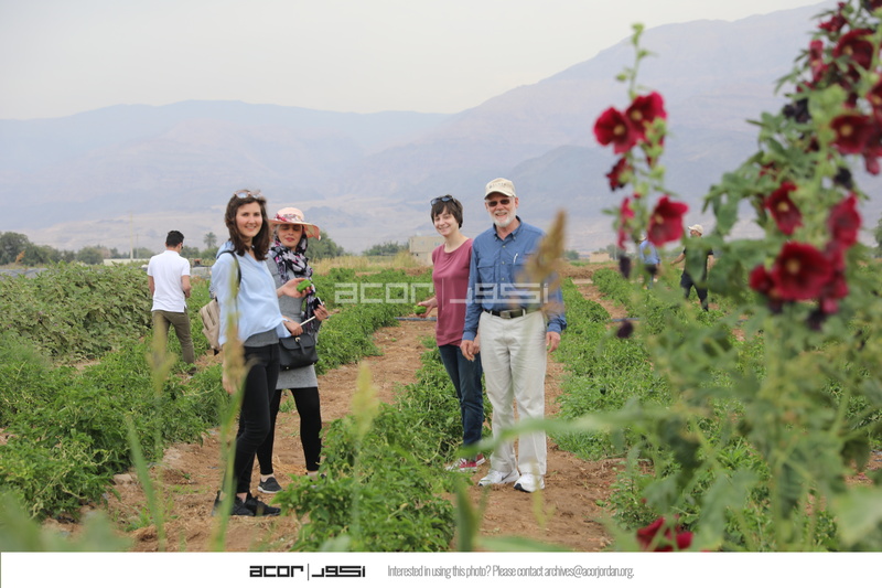 الأردن. غور الصافي، فريق المركز الأمريكي للأبحاث وأعضاء من فريق مشروع استدامة الإرث الثقافي بمشاركة المجتمعات المحلية والوكالة الأمريكية للتنمية الدولية في زيارتهم إلى مطبخ الصافي لتجربة مجموعة من تجارب السياحة الزراعية