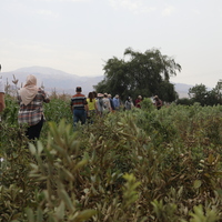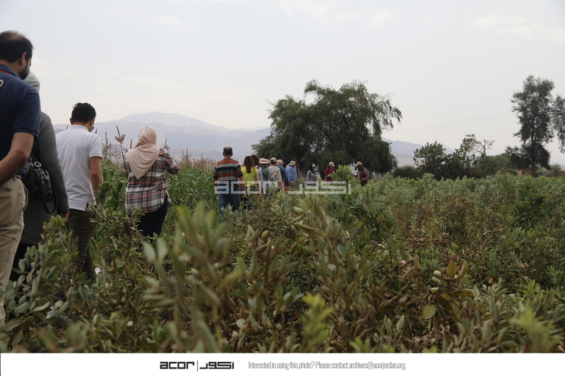 الأردن. غور الصافي، فريق المركز الأمريكي للأبحاث وأعضاء من فريق مشروع استدامة الإرث الثقافي بمشاركة المجتمعات المحلية والوكالة الأمريكية للتنمية الدولية في زيارتهم إلى مطبخ الصافي لتجربة مجموعة من تجارب السياحة الزراعية