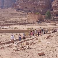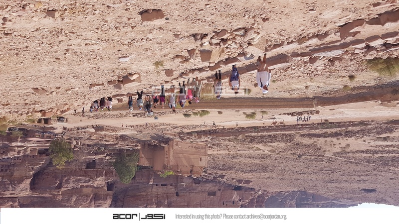 الأردن. البترا، فريق عمل الدراسة الإحصائية لتتبع زوار معبد الأسود المجنحة، يظهر في الصورة زوار في الممرات إلى المعبد
