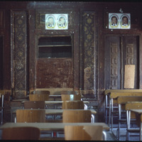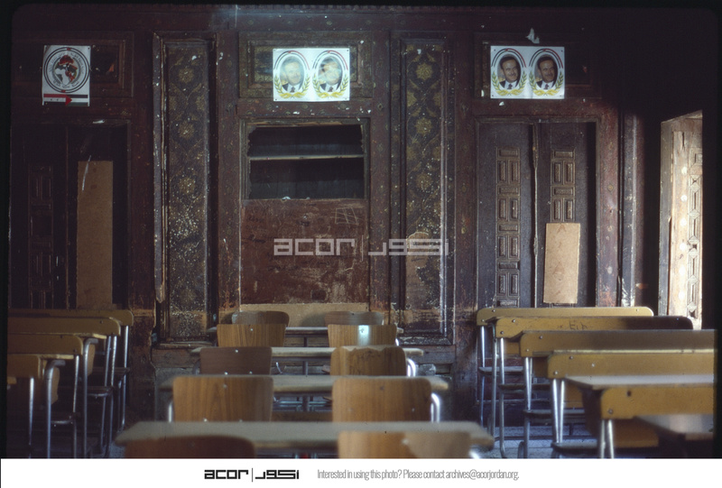 قاعة صفية في بيت غزالة يظهر فيها ملصق حافظ الأسد وشعار قد للحزب البعث العربي الاشتراكي