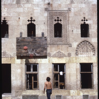 طفل يلعب كرة السلة في ساحة بيت غزالة الداخلية في حي الجديدة