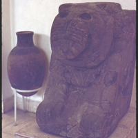 تمثال أسد وبجانبه فخار في متحف حلب الوطني