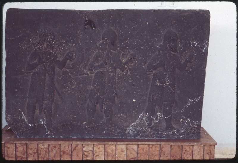 تفاصيل لمنحوتة حجرية يصوّر ثلاثة محاربين من تل حلف في متحف حلب الوطني