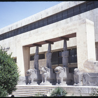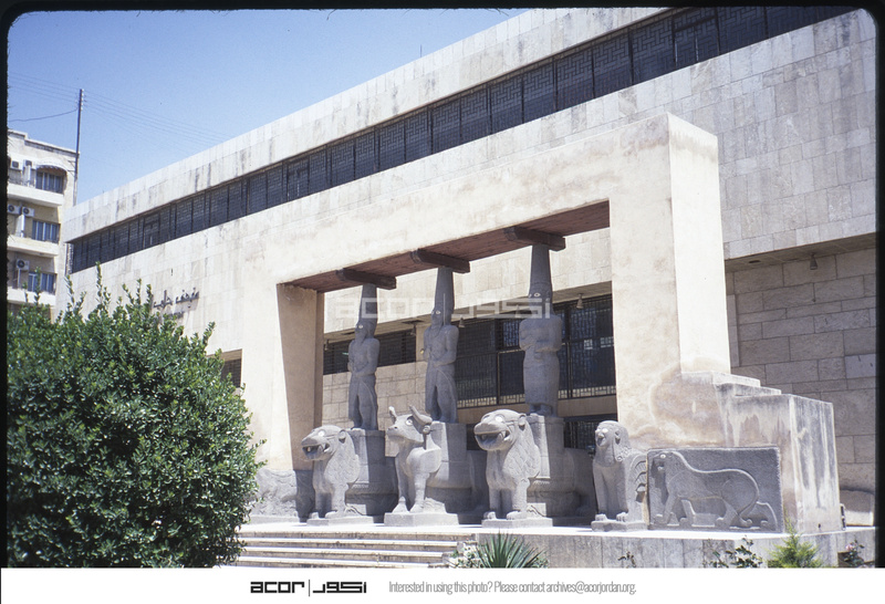 مدخل متحف حلب الوطني أمامه نسخة من واجهة القصر الملكي في تل حلف
