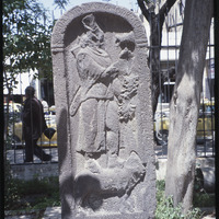 شاهد منقوش بزخارف على شكل رجل مع نقوش يونانية