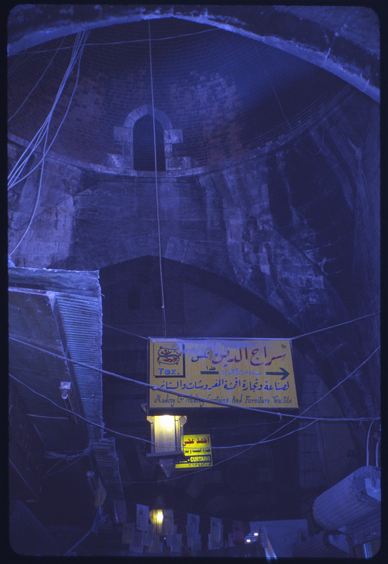 صورة من داخل سوق المدينة في حلب تظهر فيها لافتة متجر لصناعة وتجارة أقمشة المفروشات والستائر