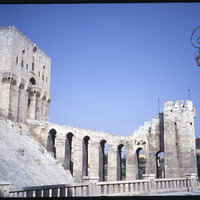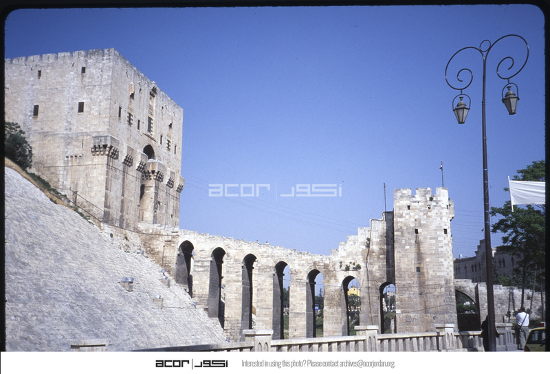 صورة تبين الجسر الواصل بين المدخلين الخارجي والداخلي لقلعة حلب، يتوسطهم أحد بروج القلعة