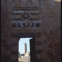 منظر لمئذنة المسجد الكبير (مقام النبي إبراهيم العلوي) من قاعة العرش في قلعة حلب