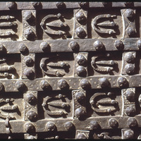 تفاصيل تصميم حدوات الخيول على باب البرج الصغير لمدخل قلعة حلب