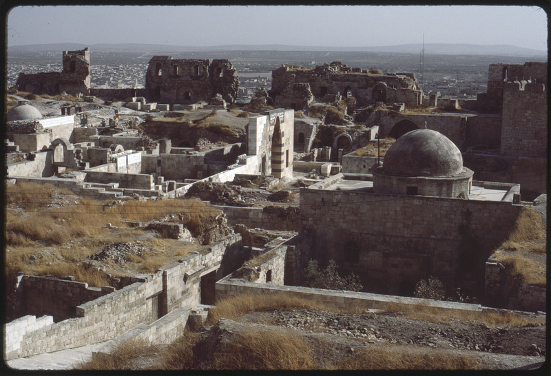منظر من سطح قلعة حلب يظهر فيه المسجد الصغير( مقام النبي ابراهيم السفلي) ومدخل إلى قاعة العرش