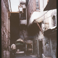 منظر زقاق تظهر فيه مباني قديمة ومشربية